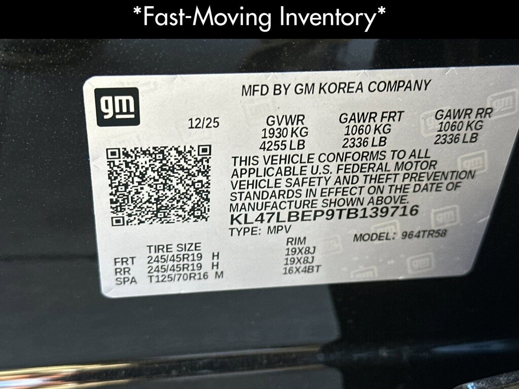 Convenience I Package (2-Way Power Driver Lumbar Control, 8-Way Power Driver Seat Adjuster, Front Doors Keyless Open, Heated Driver and Front Passenger Seats, and Heated Steering Wheel), Preferred Equipment Group G03, 2 USB Ports (1 Type-A, 1 Type-C), 3.50 Final Drive Axle Ratio, 4-Way Manual Front Passenger Seat Adjuster, 4-Wheel Disc Brakes, 6 Speakers, 6-Way Manual Driver Seat Adjuster, ABS brakes, Air Conditioning, Alloy wheels, AM/FM radio: SiriusXM, Auto High-beam Headlights, Automatic temperature control, Brake assist, Bumpers: body-color, Compass, Delay-off headlights, Driver door bin, Driver vanity mirror, Dual front impact airbags, Dual front side impact airbags, Electronic Stability Control, Emergency communication system: OnStar, Exterior Parking Camera Rear, Front anti-roll bar, Front Bucket Seats, Front Center Armrest, Front License Plate Bracket, Front reading lights, Front wheel independent suspension, Fully automatic headlights, Heated door mirrors, Illuminated entry, Leatherette Seat Trim, Low tire pressure warning, Occupant sensing airbag, Outside temperature display, Overhead airbag, Overhead console, Panic alarm, Passenger door bin, Passenger vanity mirror, Power door mirrors, Power steering, Power windows, Premium 6-Speaker Audio System Feature, Radio data system, Radio: AM/FM Stereo Audio System, Rear Parking Sensors, Rear window defroster, Remote keyless entry, Security system, SiriusXM Trial Subscription, Speed control, Split folding rear seat, Steering wheel mounted audio controls, Tachometer, Telescoping steering wheel, Tilt steering wheel, Traction control, Trip computer, Turn signal indicator mirrors, Variably intermittent wipers, Watts Link System Rear Suspension, Wheels: 18 Black Painted Aluminum, Wheels: 19 Black Painted Aluminum, and Wireless Apple CarPlay/Wireless Android Auto. Price after all Rebates. Price does not include Tax, Title, Registration, Document Fees. Customer must qualify for rebate. See Dealer for Details. Customer may qualify for additional rebates. $750 - Buick GMC Bonus Cash. Exp. 03/31/2026