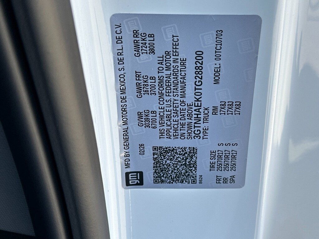 Convenience Package (Deep-Tinted Glass, Electric Rear-Window Defogger, EZ Lift Power Lock and Release Tailgate, and LED Cargo Area Lighting), Pro Value Package, Standard Suspension Package, Trailering Package (Hitch Guidance), 8-Speed Automatic, Jet Blk Clth Vinyl, 2 Charge/Data USB Ports, 2 Speakers, 2-Speaker Audio System Feature, 220 Amp Alternator, 3.42 Rear Axle Ratio, 4-Way Manual Driver Seat Adjuster, 4-Way Manual Passenger Seat Adjuster, 4-Wheel Disc Brakes, ABS brakes, Air Conditioning, AM/FM radio, Apple CarPlay/Android Auto, Auto High-beam Headlights, Automatic Emergency Braking, Brake assist, Buckle to Drive, Bumpers: chrome, Chrome Header with Flat Black Grille Insert Bars, Compass, Delay-off headlights, Driver door bin, Dual front impact airbags, Dual front side impact airbags, Electronic Stability Control, Emergency communication system: OnStar, Following Distance Indicator, Forward Collision Alert, Front 40/20/40 Split-Bench Seat, Front anti-roll bar, Front Center Armrest w/Storage, Front Frame-Mounted Black Recovery Hooks, Front Pedestrian Braking, Front reading lights, Front wheel independent suspension, Fully automatic headlights, HD Rear Vision Camera, Heated door mirrors, Illuminated entry, IntelliBeam Automatic High Beam on/Off, Lane Keep Assist with Lane Departure Warning, Low tire pressure warning, Occupant sensing airbag, OnStar Services Capable, Outside temperature display, Overhead airbag, Overhead console, Panic alarm, Passenger door bin, Passenger vanity mirror, Power Door Locks, Power door mirrors, Power Front Windows with Driver Express Up/Down, Power Front Windows with Passenger Express Down, Power steering, Power windows, Push Button Start, Radio data system, Radio: GMC Infotainment Audio System, Rear reading lights, Rear step bumper, Remote Keyless Entry, Remote keyless entry, Solar Absorbing Tinted Glass, Speed control, Speed-sensing steering, Tachometer, Tilt steering wheel, Traction control, Trip computer, Variably intermittent wipers, Vinyl Seat Trim, Voltmeter, Wheels: 17 x 8 Silver Painted Steel, Wi-Fi Hotspot Capable, and Wireless Apple CarPlay/Wireless Android Auto. Price after all Rebates. Price does not include Tax, Title, Registration, Document Fees. Customer must qualify for rebate. See Dealer for Details. Customer may qualify for additional rebates. $1750 - Buick & GMC Consumer Cash Program. Exp. 04/30/2026 $1750 - Buick GMC Bonus Cash. Exp. 04/30/2026