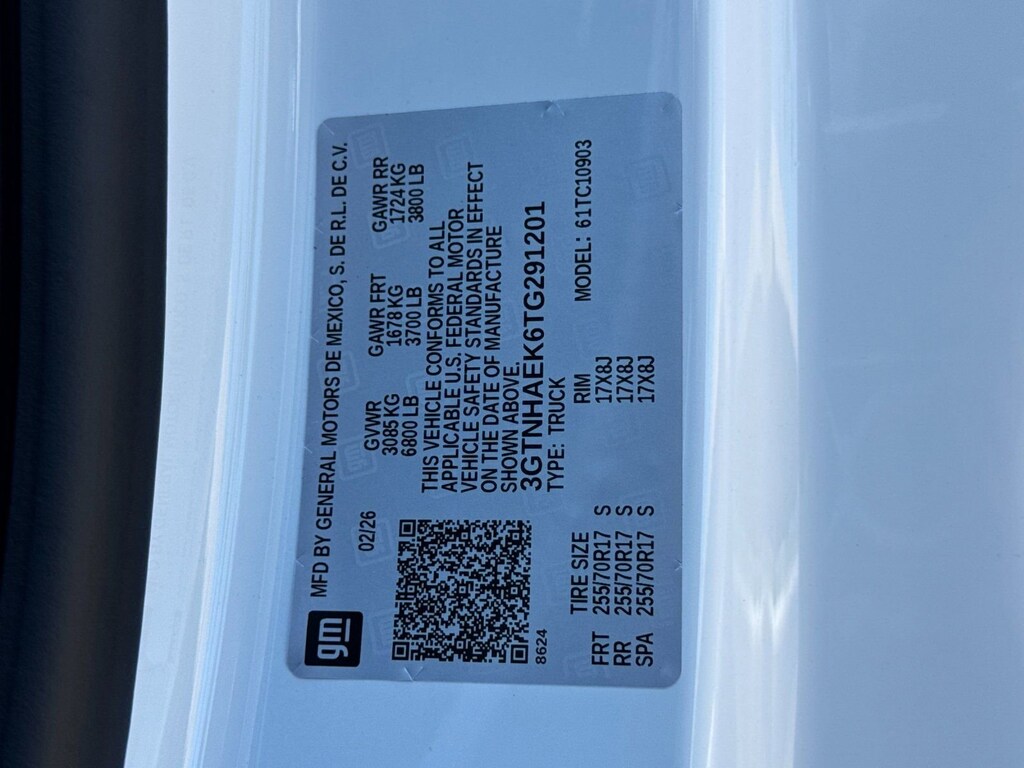 Convenience Package (Deep-Tinted Glass, Electric Rear-Window Defogger, EZ Lift Power Lock and Release Tailgate, and LED Cargo Area Lighting), Pro Value Package, Standard Suspension Package, Trailering Package (Hitch Guidance), 8-Speed Automatic, Jet Blk Clth Vinyl, 2 Charge/Data USB Ports, 2 Speakers, 2-Speaker Audio System Feature, 220 Amp Alternator, 3.42 Rear Axle Ratio, 4-Way Manual Driver Seat Adjuster, 4-Way Manual Passenger Seat Adjuster, 4-Wheel Disc Brakes, ABS brakes, Air Conditioning, AM/FM radio, Apple CarPlay/Android Auto, Auto High-beam Headlights, Automatic Emergency Braking, Brake assist, Buckle to Drive, Bumpers: chrome, Chrome Header with Flat Black Grille Insert Bars, Compass, Delay-off headlights, Driver door bin, Dual front impact airbags, Dual front side impact airbags, Electronic Stability Control, Emergency communication system: OnStar, Following Distance Indicator, Forward Collision Alert, Front 40/20/40 Split-Bench Seat, Front anti-roll bar, Front Center Armrest w/Storage, Front Frame-Mounted Black Recovery Hooks, Front Pedestrian Braking, Front reading lights, Front wheel independent suspension, Fully automatic headlights, HD Rear Vision Camera, Heated door mirrors, Illuminated entry, IntelliBeam Automatic High Beam on/Off, Lane Keep Assist with Lane Departure Warning, Low tire pressure warning, Occupant sensing airbag, OnStar Services Capable, Outside temperature display, Overhead airbag, Overhead console, Panic alarm, Passenger door bin, Passenger vanity mirror, Power Door Locks, Power door mirrors, Power Front Windows with Driver Express Up/Down, Power Front Windows with Passenger Express Down, Power steering, Power windows, Push Button Start, Radio data system, Radio: GMC Infotainment Audio System, Rear reading lights, Rear step bumper, Remote Keyless Entry, Remote keyless entry, Solar Absorbing Tinted Glass, Speed control, Speed-sensing steering, Tachometer, Tilt steering wheel, Traction control, Trip computer, Variably intermittent wipers, Vinyl Seat Trim, Voltmeter, Wheels: 17 x 8 Silver Painted Steel, Wi-Fi Hotspot Capable, and Wireless Apple CarPlay/Wireless Android Auto. Price after all Rebates. Price does not include Tax, Title, Registration, Document Fees. Customer must qualify for rebate. See Dealer for Details. Customer may qualify for additional rebates. $1750 - Buick & GMC Consumer Cash Program. Exp. 04/30/2026 $1750 - Buick GMC Bonus Cash. Exp. 04/30/2026
