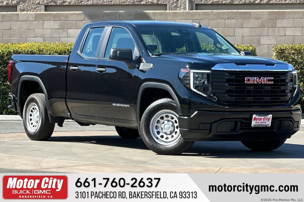 The Sierra 1500 Pro's sleek and sophisticated exterior, with its Black paint and chrome accents, exudes a bold and confident presence. Step inside and you'll be greeted by a well-appointed interior, complete with premium vinyl seating and a host of advanced technology features, including the GMC Infotainment System, Apple CarPlay, and Android Auto.